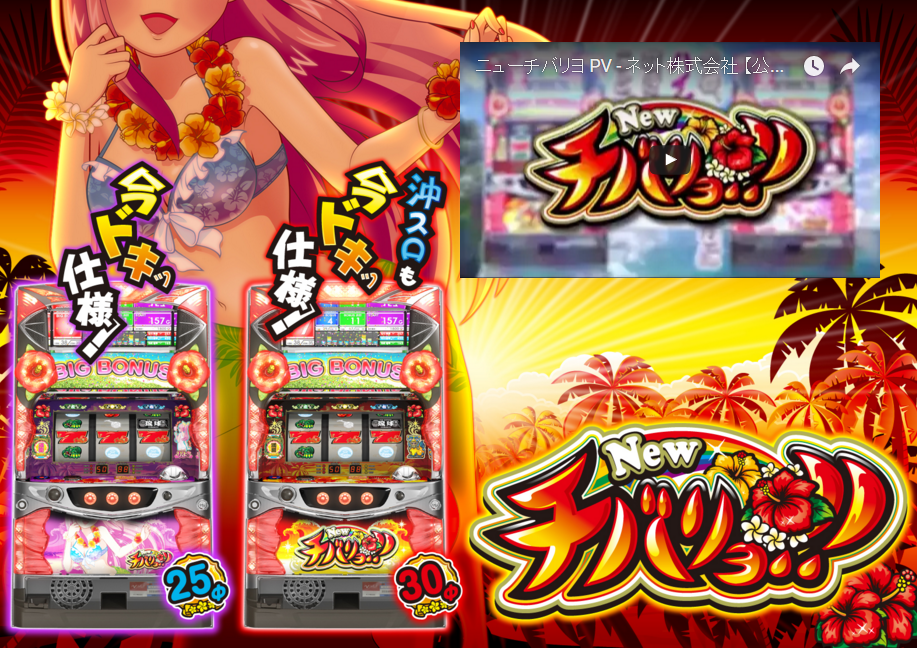 ハイビスカスが光ればボーナス確定!ボーナス図柄が自動で揃う、目押し不要の簡単仕様!純増約200枚のチバリヨビッグボーナス、純増約100枚のビッグボーナス、純増約50枚のレギュラーボーナスを搭載!毎ゲーム抽選の安心設計に加え、多彩な告知演出でボーナス&モードをお知らせ!リゾート気分が味わえる南国映像と遊技履歴がひと目で分かる遊技データ表示機の二分割液晶を採用!遊技データの背景が光ったり、ボーナス終了画面の種類など、液晶ならではの告知演出にドキッとすること間違いなし!シリーズ伝統のパトランプ演出が出現すると32ゲーム間はドキッドキッ!?